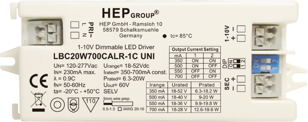 HEP LED Treiber, Konstantstrom, dimmbar, 350-700mA per DIP, 20W (1-10V)